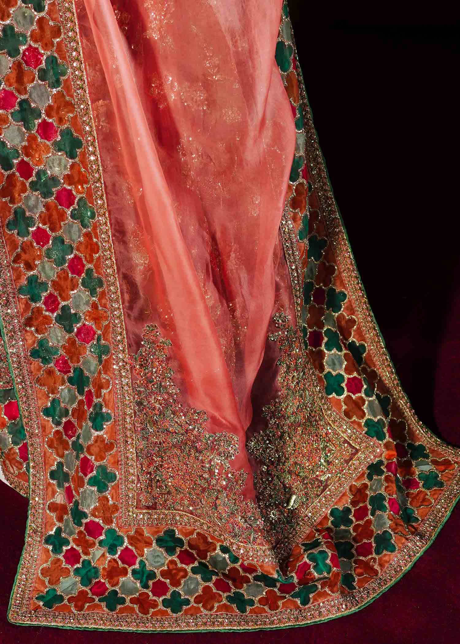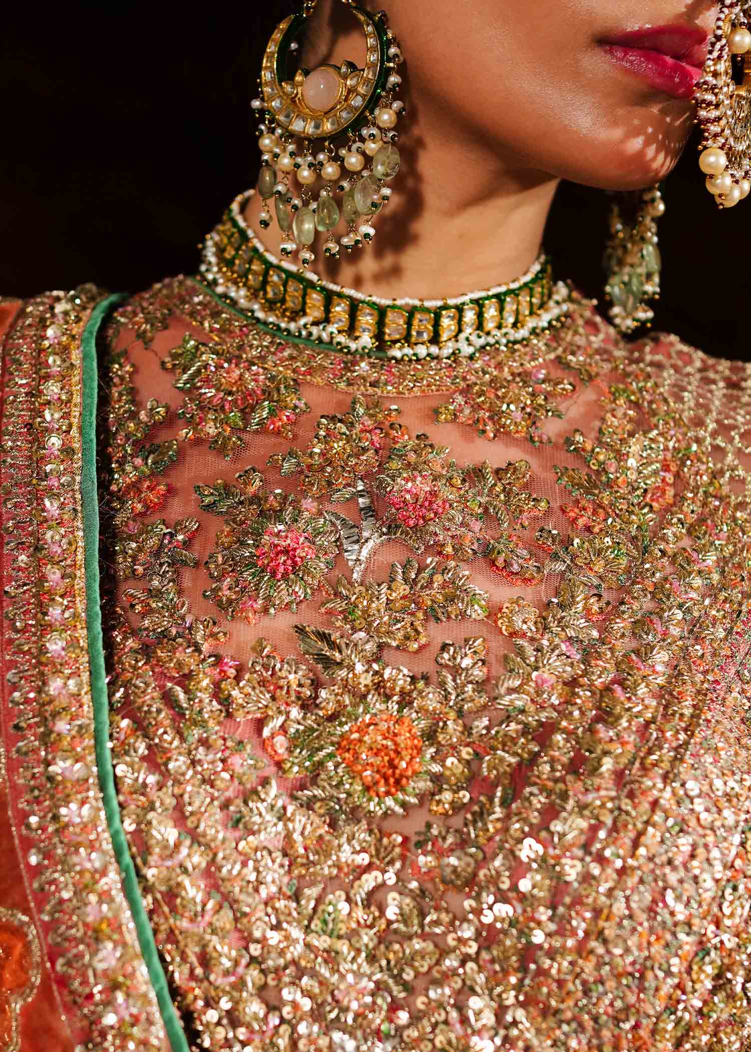 A spectacular rose gold net peshwas. The exquisite reham embroidery, enhanced with intricate adda work, elevates this ensemble to new heights of elegance. The medium silk crushed sharara, adorned with organza chatapati borders, exudes a sense of regal sophistication. And the organza dupatta, adorned with mesmerizing adda work, and organza chatapatti four sided borders adding a touch of ethereal beauty.
