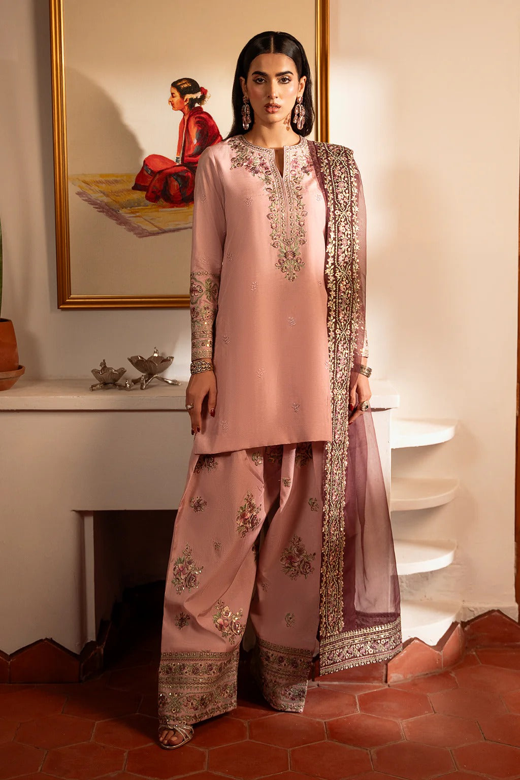 Matching lilac floral embroidered farshi shalwar with intricate borders.